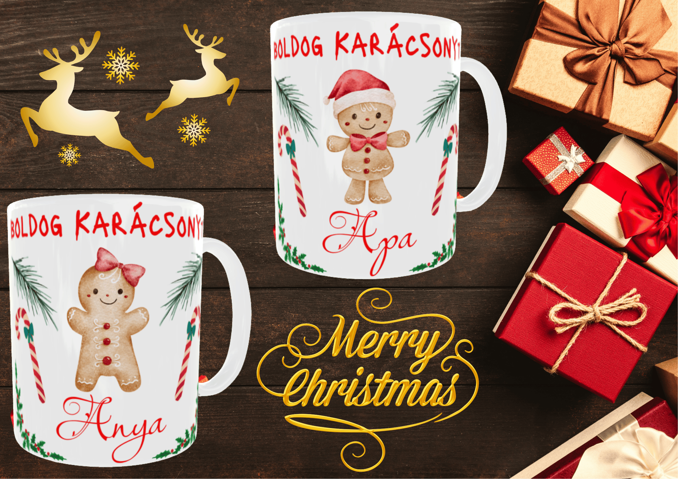 „Ünnepi bögre Boldog Karácsonyt Anya felirattal, fenyőággal és mézeskalács figurával – tökéletes karácsonyi ajándék.”